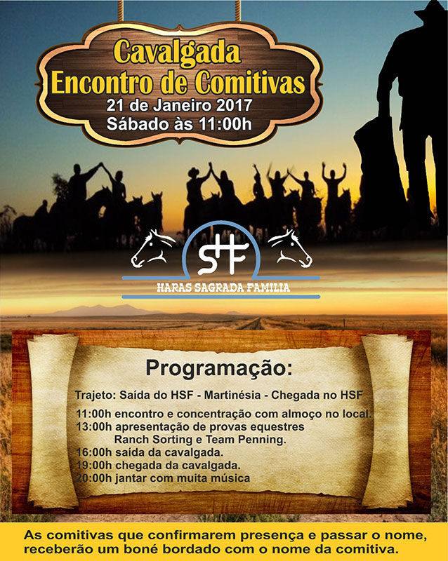 Haras Sagrada Família Rodovia Neuza Rezende Km 17 à direita - Distrito de Cruzeiro dos Peixotos, Uberlândia, MG, BrasilProgramação: 11:00h encontro e concentração com almoço no local 13:00h apresentação de provas equestres Ranch Sorting e Team Penning 16:00h saída da cavalgada 19:00h chegada da cavalgada 20:00h jantar com muita música